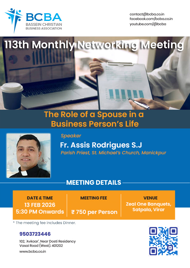 Bassein Christian Business Association brings like-minded Christian businessmen, entrepreneurs, professionals together for mutual connectivity and growth and thus create an environment of success for all based on Christian values.